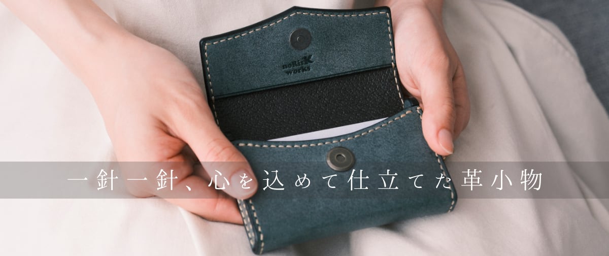 ー ー ー ー ー ー ー ー ー ー ー ー ー ー 使い込むほどに美しさが増す 上品さと高級感が際立つロロマレザー ビジネスシーンで記憶に残る第一印象に 内側を豚革で裏打ちすることで 高級感と耐久性を高めてあります 2つのポケットを用意 ■メインポケットには20枚程度を収納 ■サブポケットには5枚程度を収納 シンプル、かつ、洗練されたデザインで どんなビジネスシーンにもマッチします ー ー ー ー ー ー ー ー ー ー ー ー ー ー 【革の特徴】 純国産の高品質のロロマレザー 植物タンニンを用いて2回の鞣し加工を施す手間のかかった製法 天然ワックスを染み込ませて作られています。 白い表面は「ブルーム」と呼ばれるもので 最初はマットな風合いですが、使用するほどに艶が出て味わい深く変化 そして、使い込むことで宝石のような美しい革へと変化していきます。 ロロマレザーは、その独特の製法と経年変化の美しさから 財布や革小物に人気の素材です。 ー ー ー ー ー ー ー ー ー ー ー ー ー ー 【お手入れ】 特別なお手入れを必要としません。 お手入れが不要なところも、人気の素材です。 ※水に濡れた場合は早めに拭き取ってください。 ー ー ー ー ー ー ー ー ー ー ー ー ー ー 【総手縫い】 職人が「ひと穴ひと穴」心を込めて縫っています。 ー ー ー ー ー ー ー ー ー ー ー ー ー ー 【サイズ】 横 110 × 縦 70 × 厚 12 (mm) ー ー ー ー ー ー ー ー ー ー ー ー ー ー 【私の作品について】 一つひとつ丁寧に製作していますが 天然素材を使用したハンドメイド作品のため 多少の誤差などが発生する可能性がございます。 お使いのモニターなどにより、実際の色味が異なる可能性がございます。 色移りにご注意くださいませ。 特に、濡れたり湿度が高いときは色移りしやくなります。 ー ー ー ー ー ー ー ー ー ー ー ー ー ー 【納期について】 こちらは受注生産となります。 1〜2週間ほどのお時間を頂戴いたします。 ※在庫がある場合、1~2日で発送いたします。 #のりすけ #ノリスケ #noRisK works